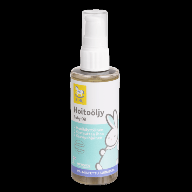 Ainu Hoitoöljy on hajusteeton hoitoöljy vauvan ihonhoitoon ja koko perheelle. Se sopii käytettäväksi jo vastasyntyneestä alkaen. Hoitoöljy suojaa ja pehmentää kuivaa ihoa ja on erinomainen valinta esimerkiksi vauvahierontaan, kylpyveteen sekä päänahan karstan pehmittämiseen ja poistoon.