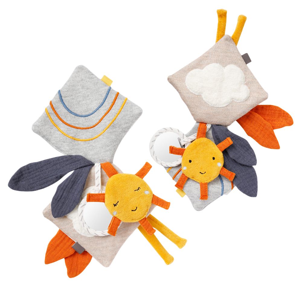 Värikkäitä ja suloisia, näköaistia stimuloivia hahmoja ja kuvioita täynnä oleva pehmeä katselukirja vauvalle. Suloiset hahmot ja värit houkuttelevat lasta tutkimaan ja katselemaan. Kirjan sivuilta löytyy myös peili sekä erilaisia tekstuureita sekä materiaaleja, joita on kiva tunnustella ja hypistellä. Kirjan kulmassa kiinnitysnauhat, jolla kirjan voi kiinnittää esim. turvaistuimeen tai rattaisiin.