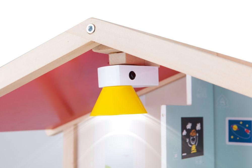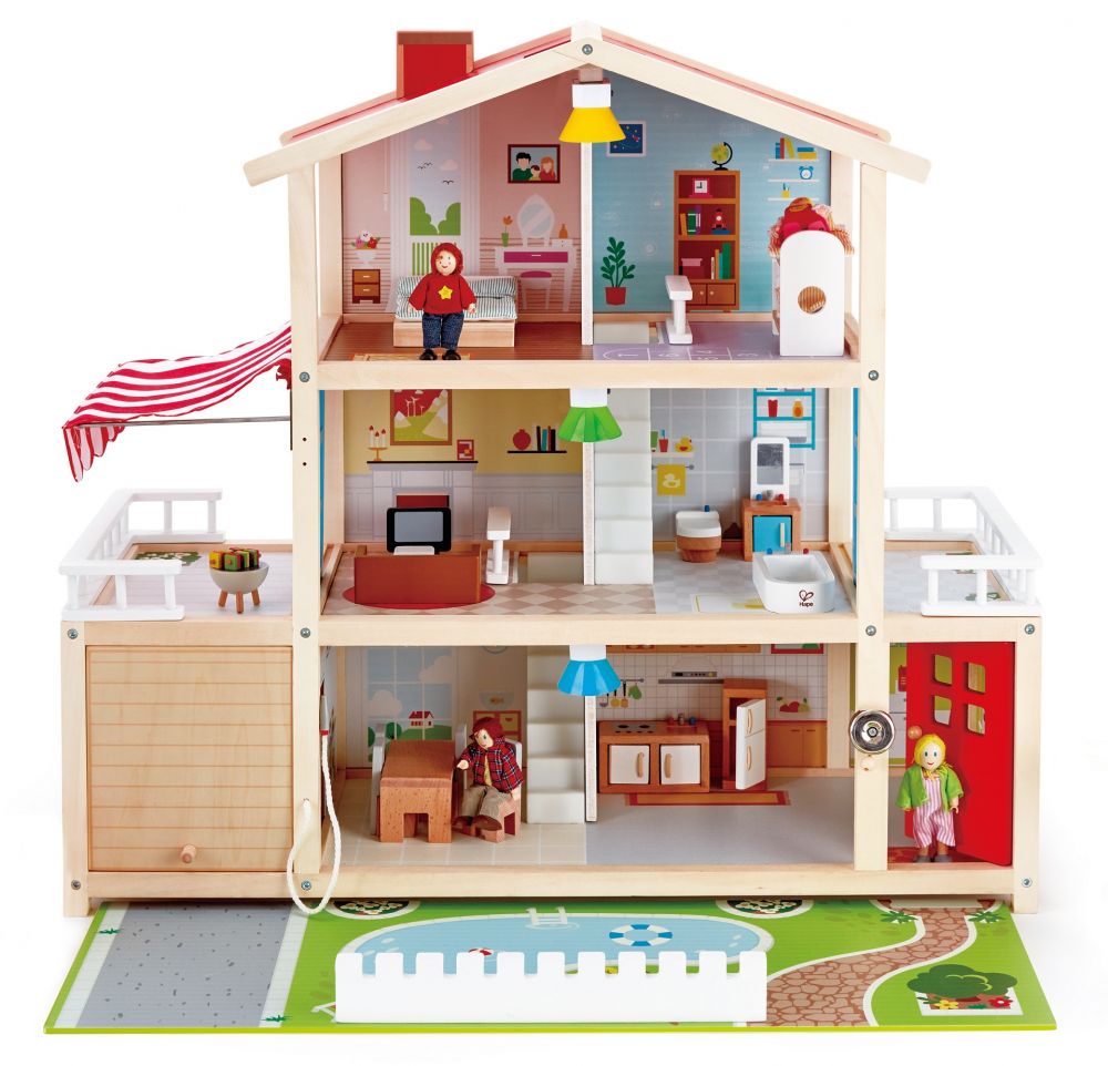 Puinen kalustettu nukkekoti, jonka seinät on kauniisti kuvitettu. Nukkekodissa on kivoja yksityiskohtia mm. ledilamput jokaisessa kerroksessa, kaksi parveketta, autotalli sekä soiva ovikello. Piha-alueen saa käyttöön vetämällä sen esiin nukkekodin alta. Yhteensä 29 osaa. Tuotteen koko: 80x29x73 cm. Paketin koko: 83x13x74 cm. Kasattava tuote. Ikäsuositus: 3+.