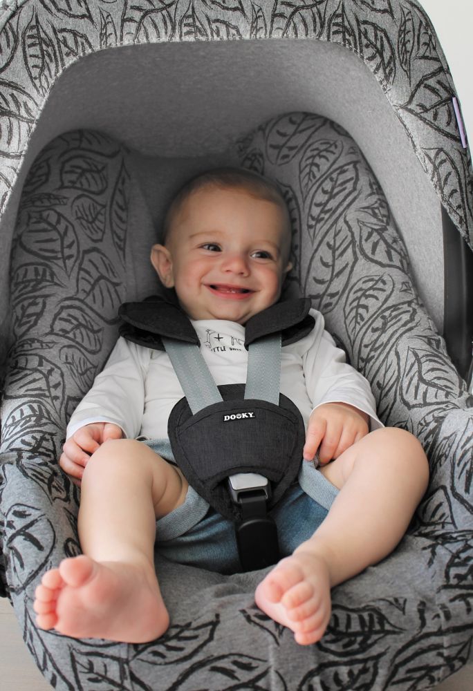 Dooky Universal Turvavyöpehmusteet lisäävätlapsen matkustusmukavuutta turvakaukalossa pehmentäen turvavöiden hihnat ja soljen.